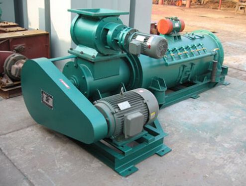 粉尘加湿搅拌机的搅拌筒通过其两侧的支撑架固定在机座上,给料电机固定在给料斗的旁边。粉尘加湿搅拌机进料筒位于给料斗的下部,进料筒与搅拌筒同轴心且相互连通,主轴位于搅拌筒及进料